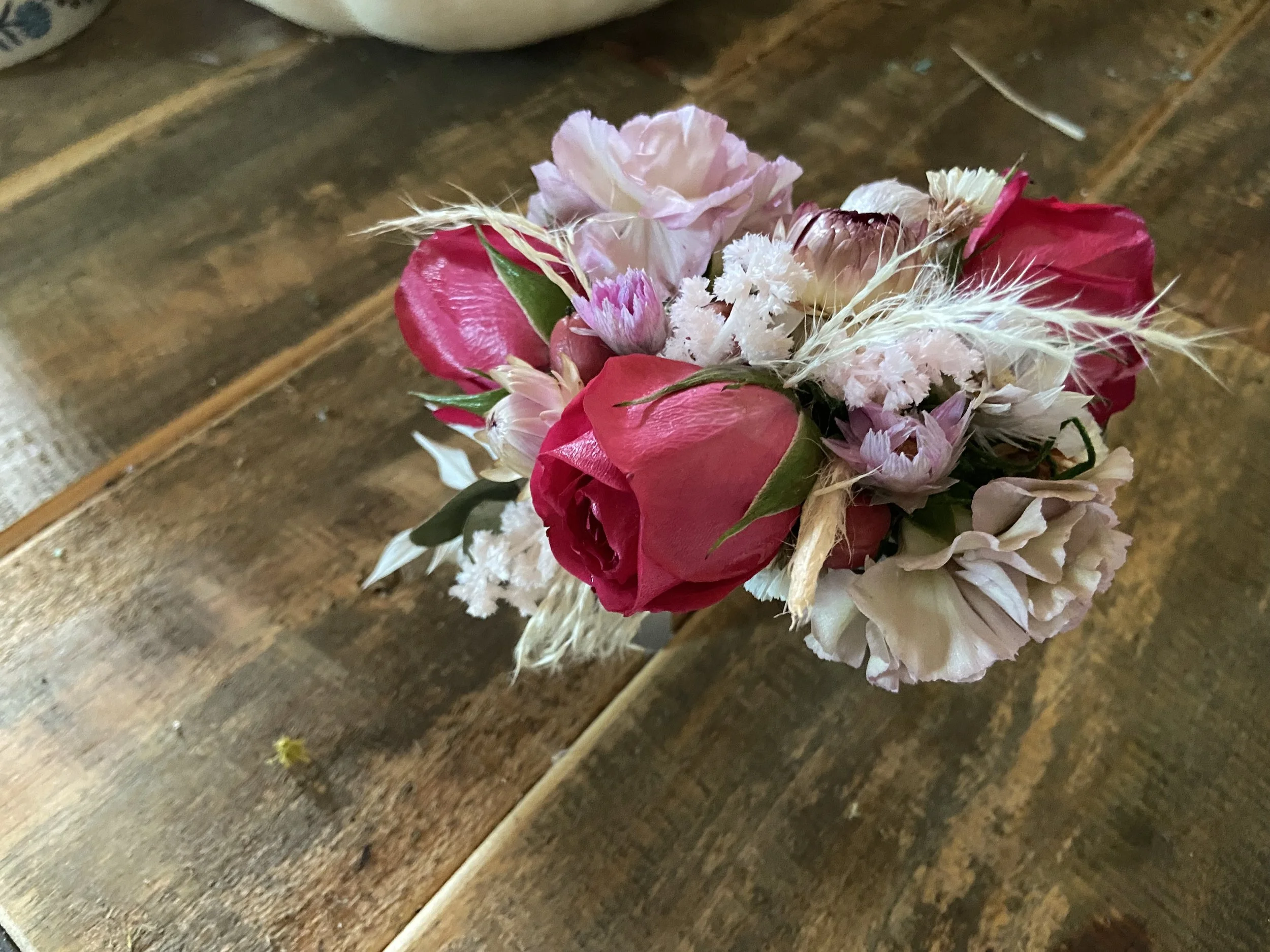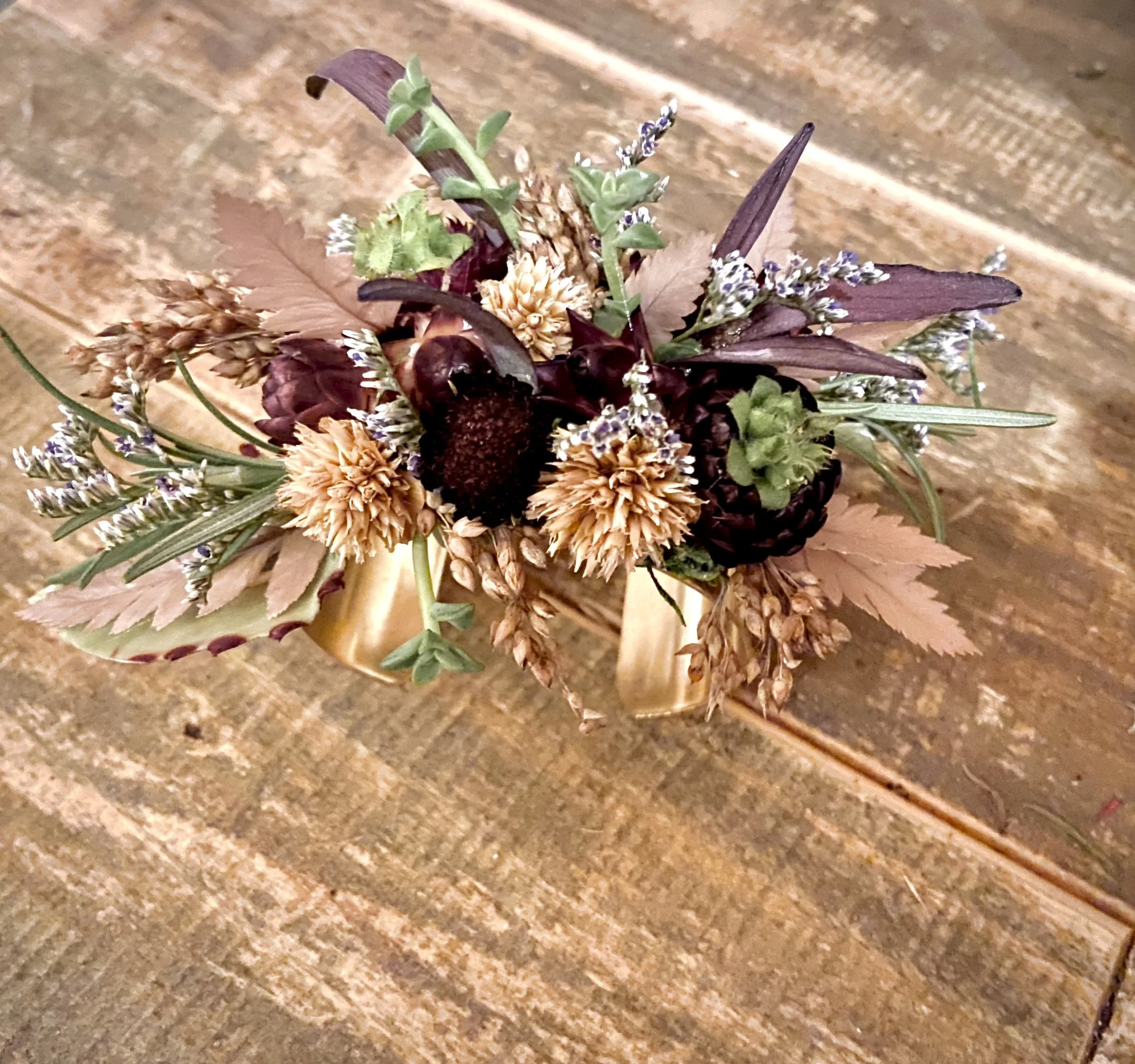 A boutonniere dresses up any occasion, especially when you match your date. Our boutonnieres are customizable to match your dates dress, or to match your suit. We can use fresh, dried or a combination of fresh and dried florals to create your one of a kind boutonniere.