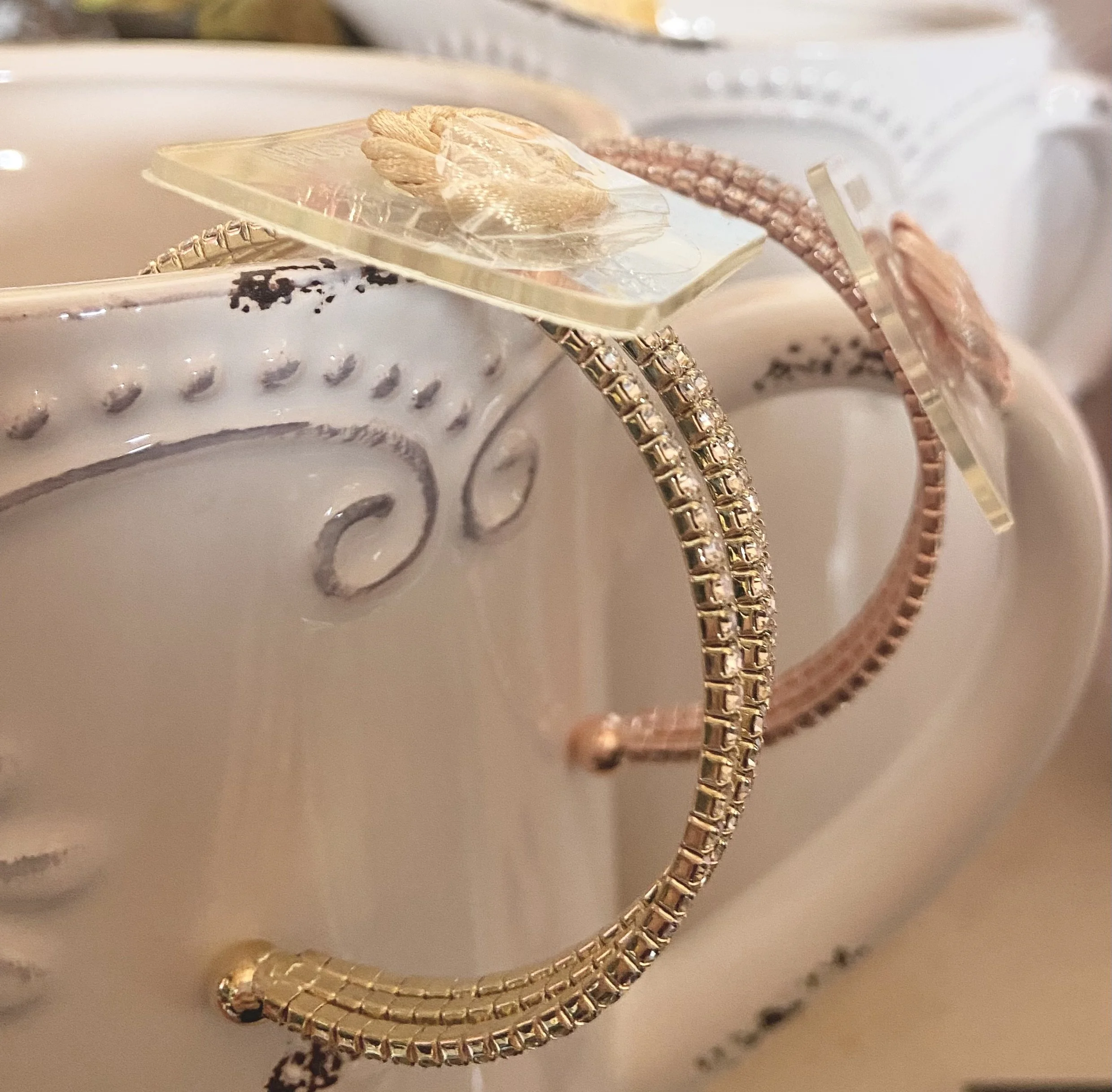 Modern cuffs come in gold or silver. We design these with fresh, dried or a mix of fresh and dried florals. You tell us the palette you’d like and you can always tell us more details about your dress to help us design a one of a kind custom cuff for you.