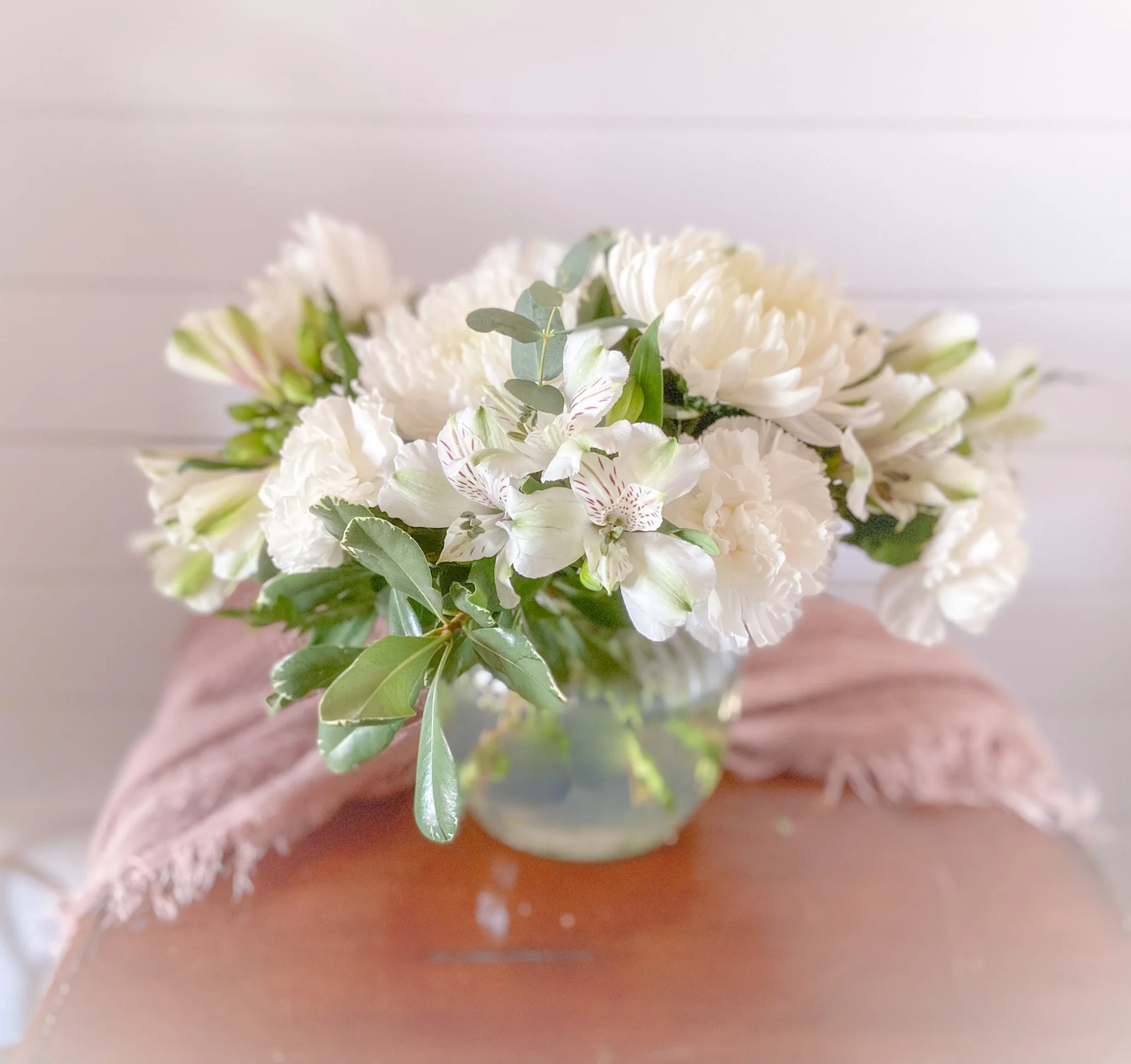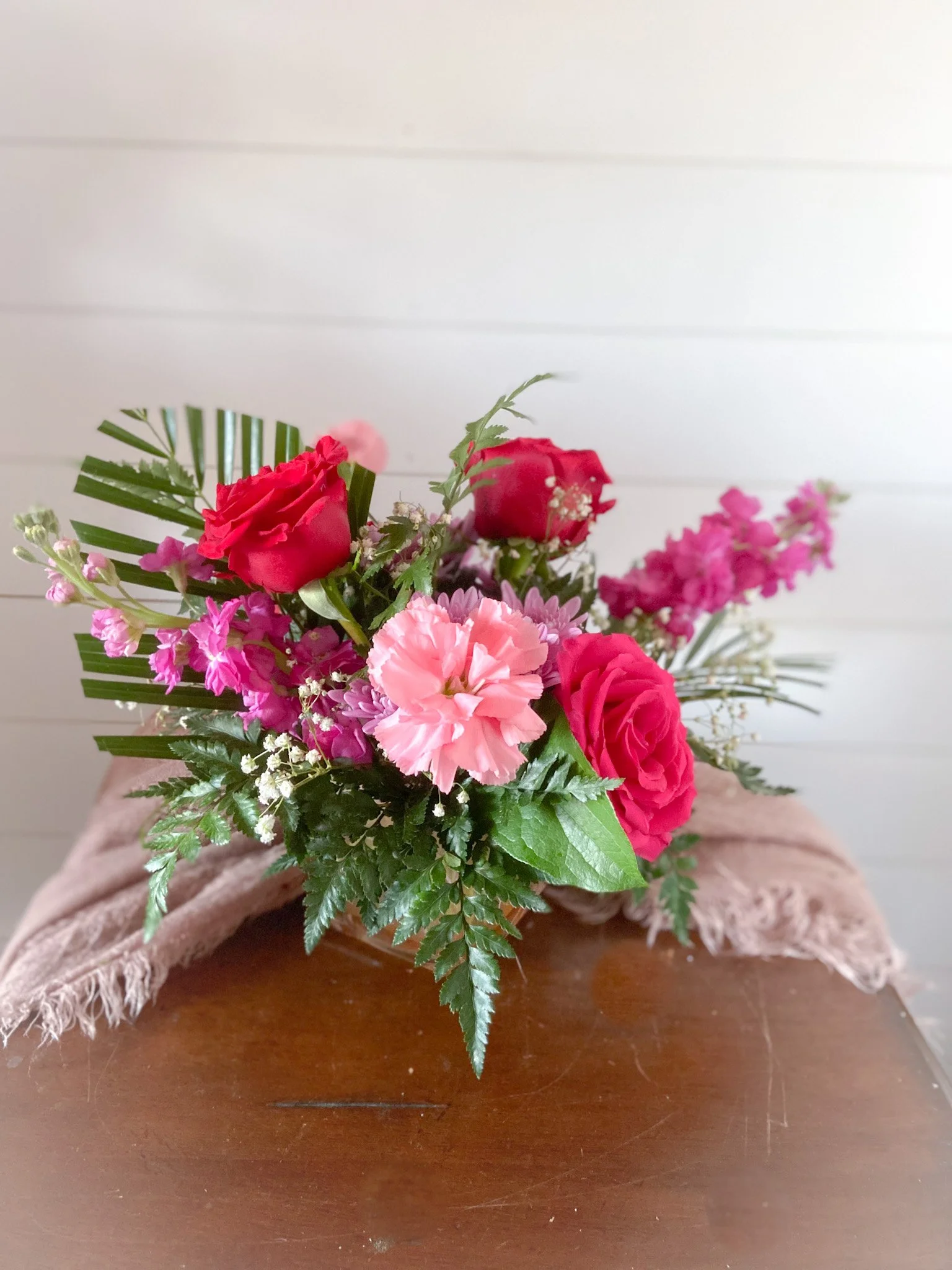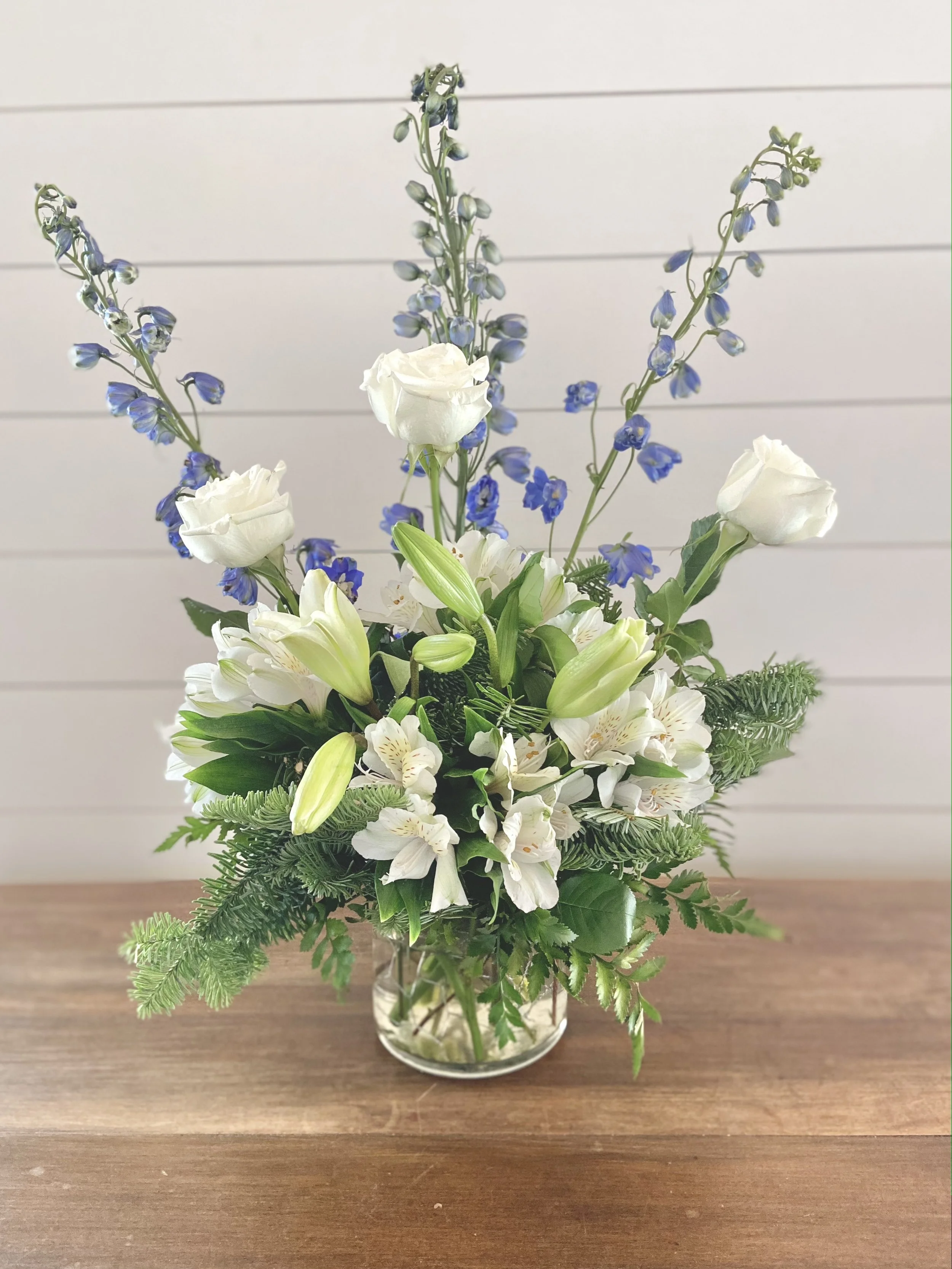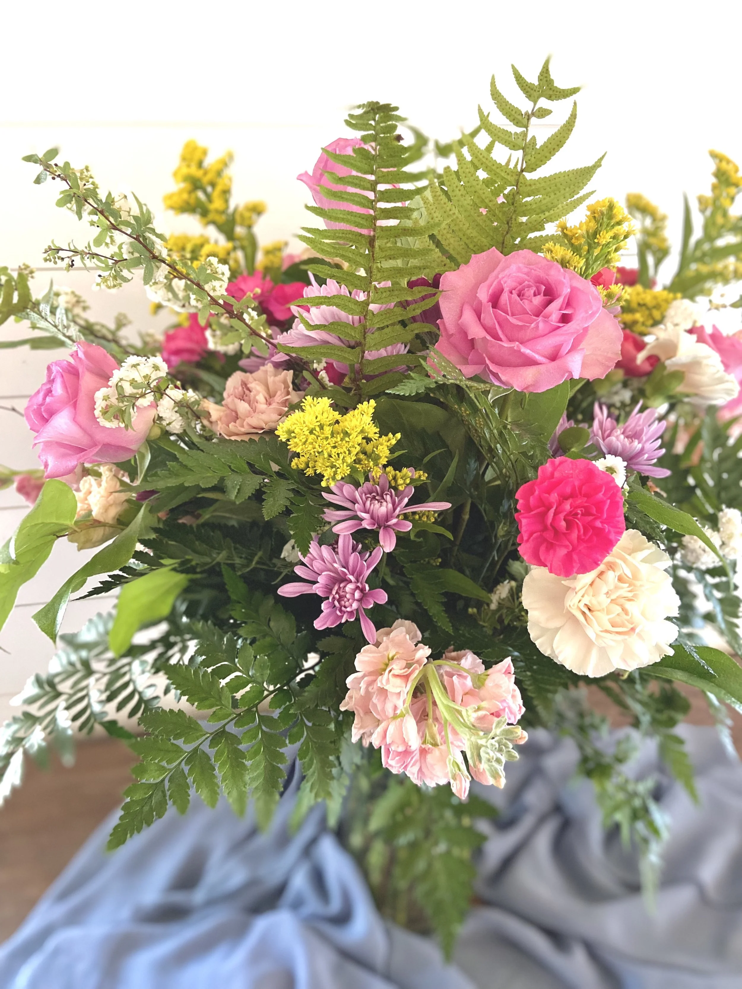 These sprays are our signature sympathy arrangements. Each is unique, because we use our farm florals to add a special feeling of comfort and community. We can also design these sympathy arrangements using only roses, carnations or mums, but we love designing with a garden fresh look. We offer the open heart sprays in sizes 18” or 24”.